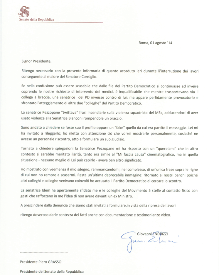 Per darvi un po’ l’idea. Questa è la lettera inviata dal M5S (scritta da Giovanni Endrizzi – Portavoce Cinque Stelle Senato) al Presidente Grasso sui gravi fatti di ieri sera 31/07 in aula, in cui si racconta una storia che su tg e giornali non vedrete mai
